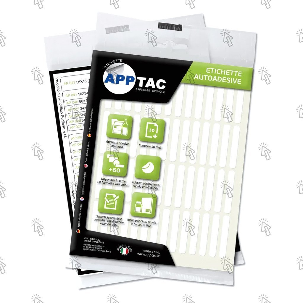 Etichette adesive AppTac: formato etichetta 34 X 5 mm, formato carta foglio A5, numero etichette per foglio (60 per foglio), confezione da 10 fogli