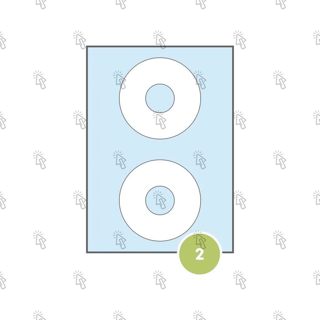Etichette adesive per CD / DVD AppTac: diametro esterno etichetta Ø 117.5, colore bianco, formato carta foglio A4, numero etichette per foglio (2 per foglio), confezione da 100 fogli