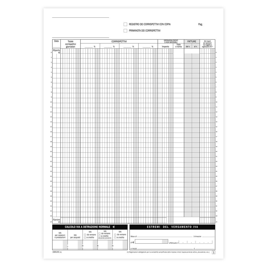 Blocco Data Ufficio registro dei corrispettivi: foliazione 24 fogli, numero copie in duplice copia, autoricalcante, formato 29.7 X 21.5 cm
