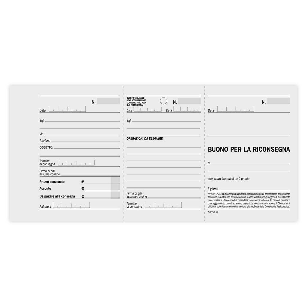 Moduli di Lavori di riparazione su oggetti • Data Ufficio •‣ | confezione di 50 u. | 10 × 21,5 cm | a 3 tagliandi (matrice-scontrino-oggetto) |